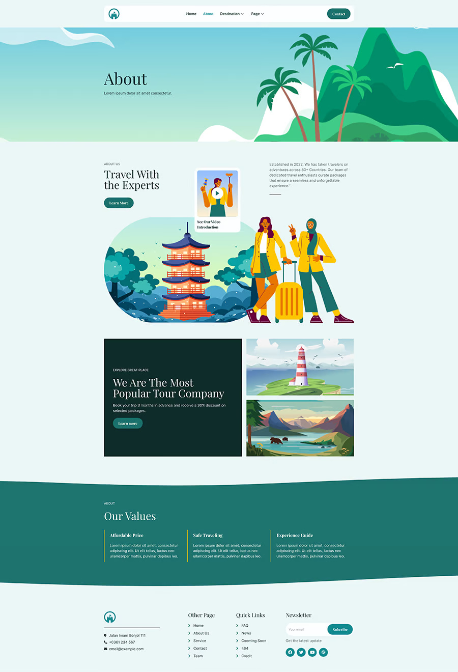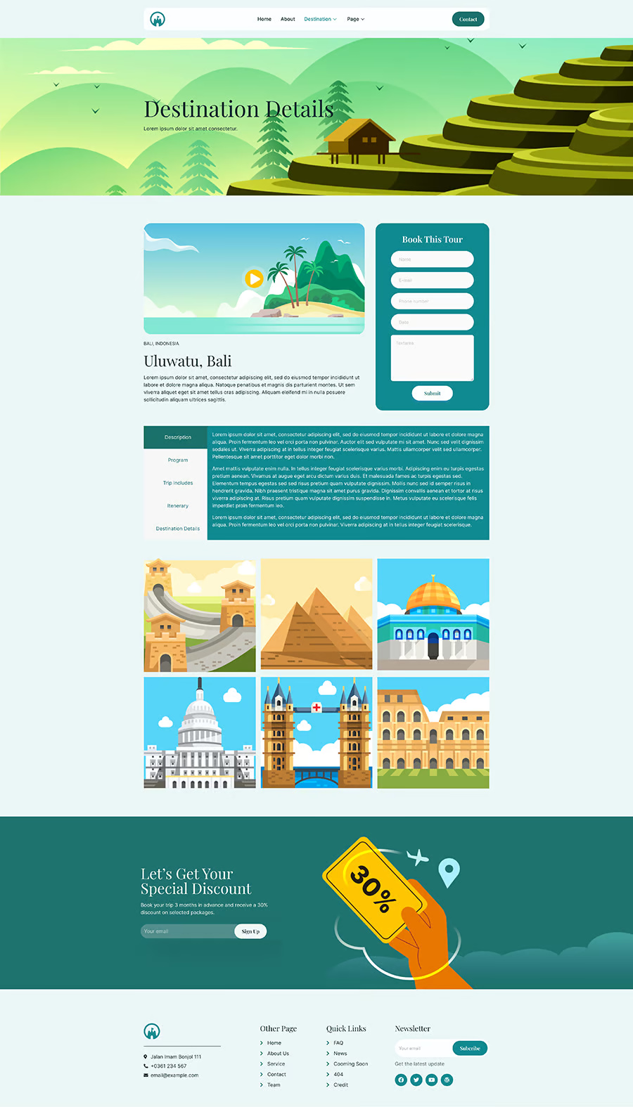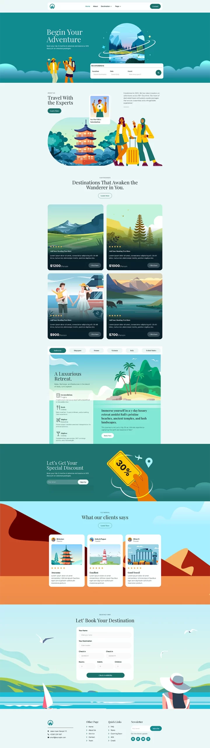 This Website is perfect for travel agencies and tour planning to make your world colorful with the best touring destinations in the world. This website has a beautiful and unique design with a 100% responsive layout & retina-ready and very easy to customize.